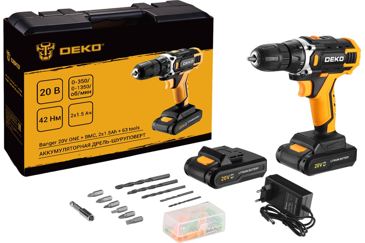 Аккумуляторная дрель-шуруповерт DEKO Banger 20V ONE + в кейсе + набор 63 инструмента для дома, 20В,