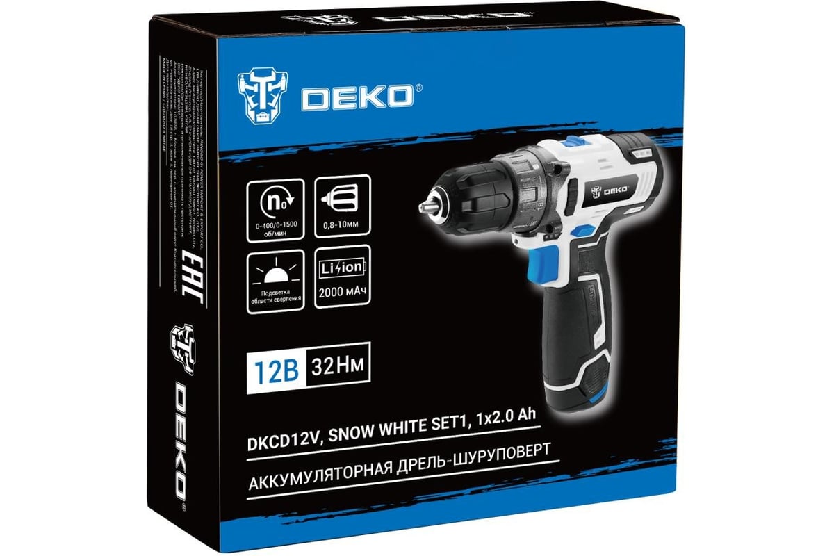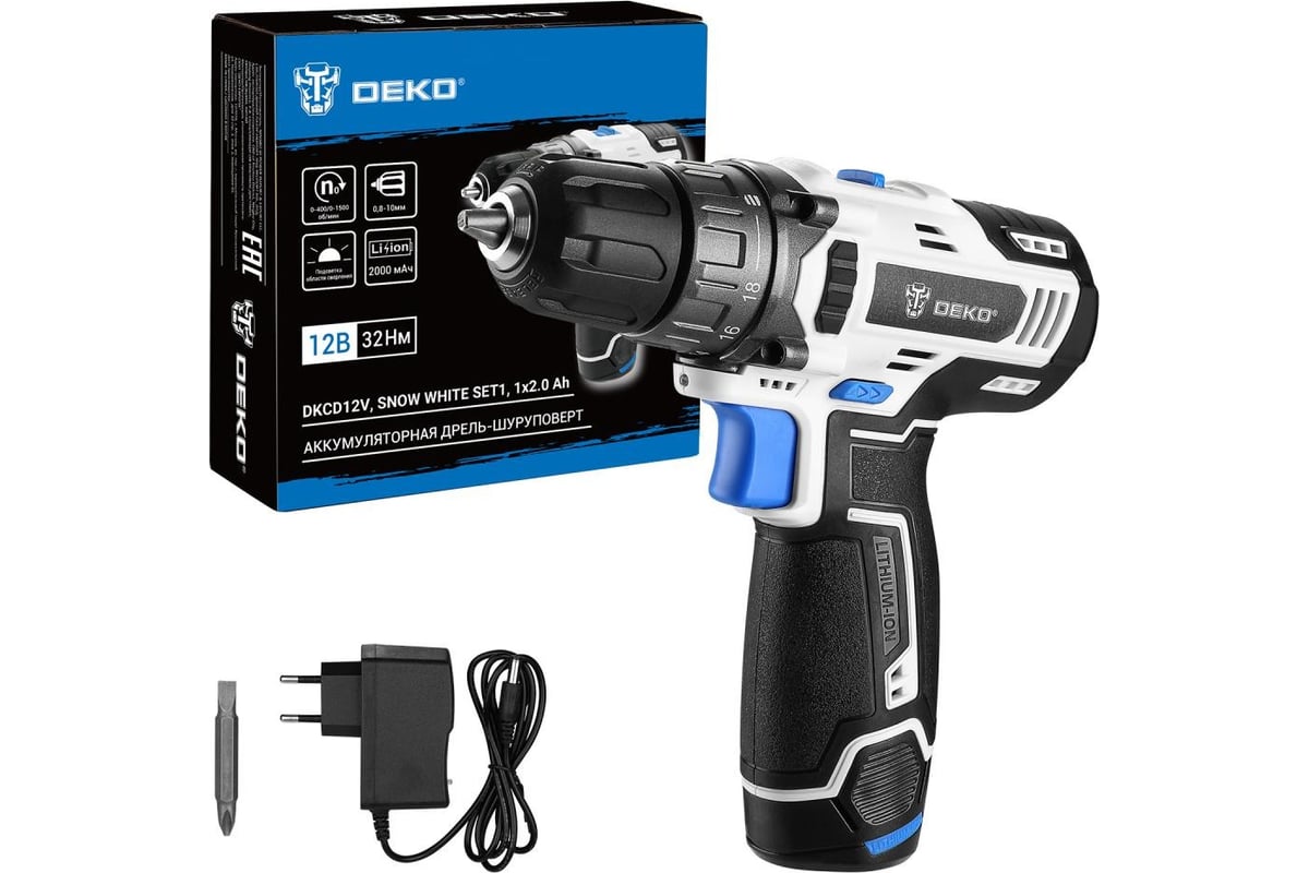 Аккумуляторная дрель-шуруповерт DEKO DKCD12V, SNOW WHITE SET1, 1х2.0 Аh предназначена для строительных, слесарно-монтажных работ. Инструмент помогает быстро высверливать отверстия нужного диаметра как на деревянной, так и металлической поверхности, быстро вкручивать или извлекать крепеж.