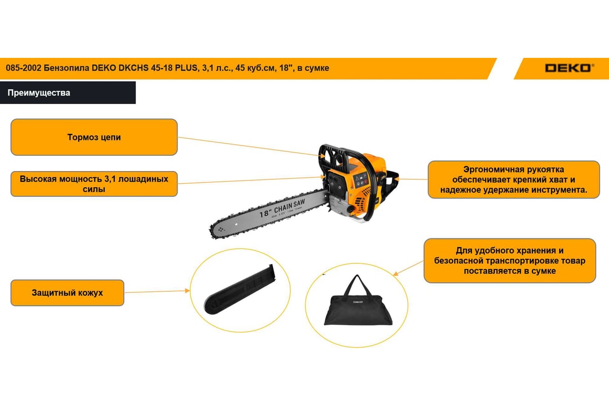 Deko 085-2002 Бензопила 3,1 л.с., 45 куб.см, 18", в сумке