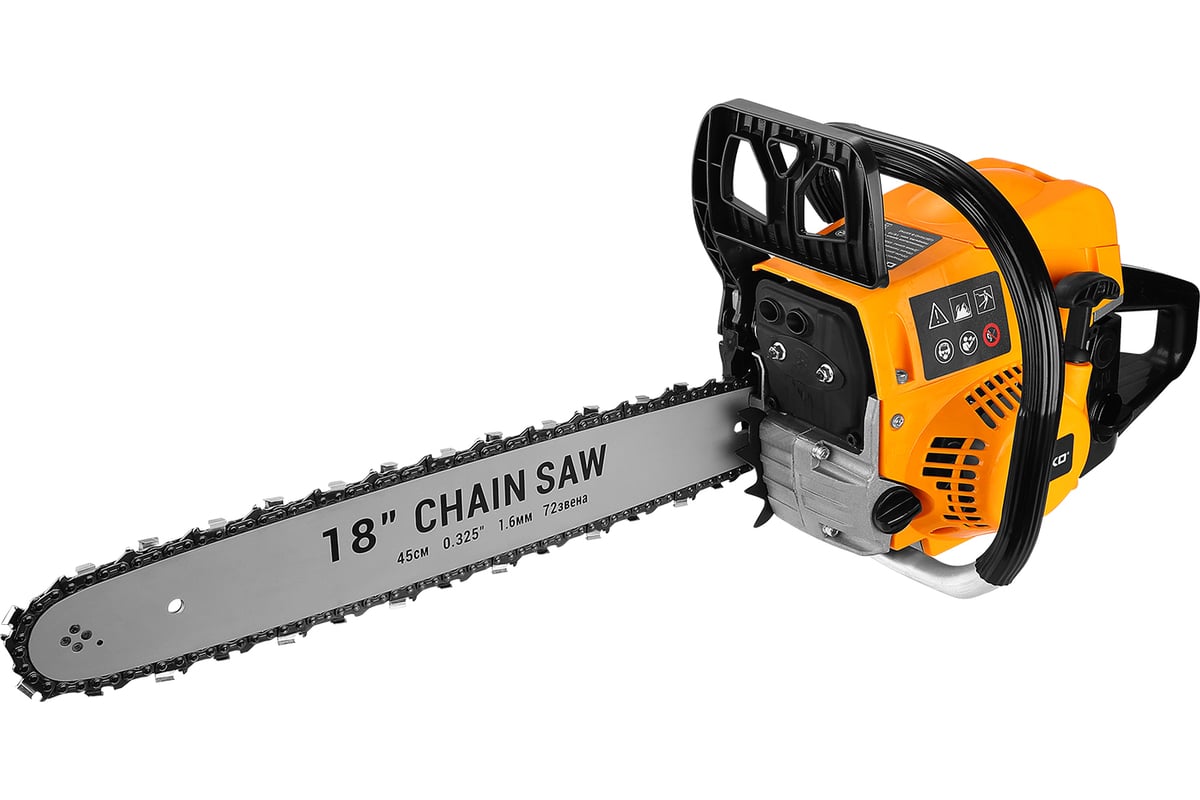 Бензопила DEKO DKCHS 45-18 PLUS, 3,1 л.с., 45 куб.см, 18", в сумке - мощный и надежный инструмент для распила древесины, подойдет для ухода за деревьями на участке, а также для заготовки дров. Защитный щиток является одновременно защитой для рук оператора и тормозом цепи, что не позволяет нанести травмы при соскальзывании и обрыве оснастки. Эргономичная задняя рукоять обеспечивает крепкий хват и надежное удержание инструмента.