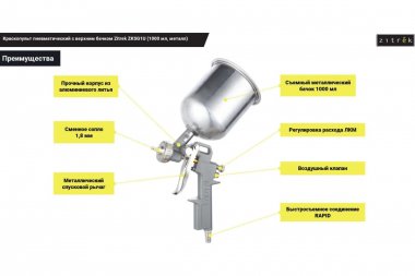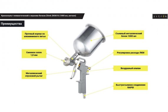 Краскопульт пневматический с верхним бачком Zitrek ZKSG1U (1000 мл, металл) предназначен для нанесения краски и лака, а также содержащих растворители и разбавляемых водой эмалевых красок, прозрачных лаков, покрывных лаков для автомобилей, морилок, масел и других текучих материалов (распыляемых сред) на подходящие для этого объекты посредством сжатого воздуха.