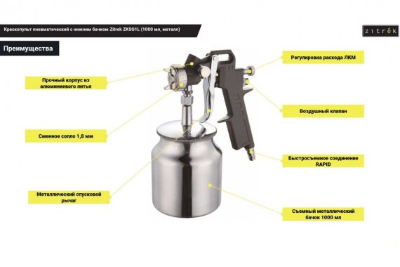 Краскопульт пневматический с нижним бачком Zitrek ZKSG1L (1000 мл, металл) предназначен для нанесения краски и лака, а также содержащих растворители и разбавляемых водой эмалевых красок, прозрачных лаков, покрывных лаков для автомобилей, морилок, масел и других текучих материалов (распыляемых сред) на подходящие для этого объекты посредством сжатого воздуха.