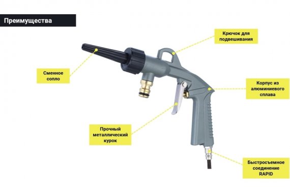 Пистолет пневматический моющий без бачка Zitrek ZKWG02 Максимальное давление: 6,5 Бар Габариты без упаковки 289х43х100 мм