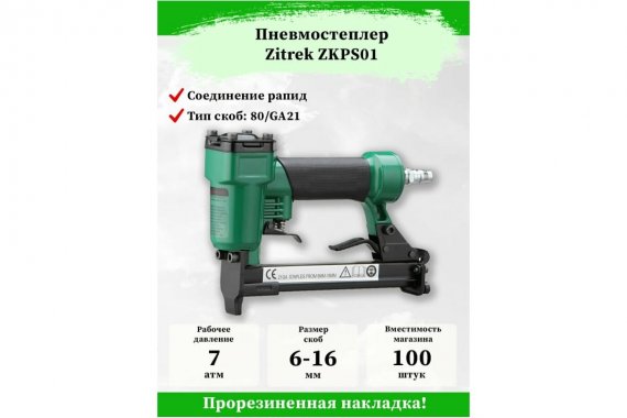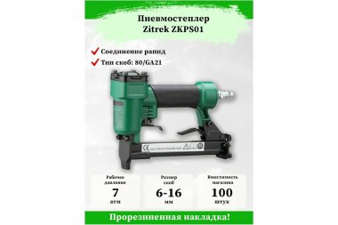 Пневматический степлер для скоб Zitrek ZKPS01 018-1133 используется для крепления гипсокартона, утеплителя, фанеры и прочего. В качестве оснастки применяются скобы размером 6-16 мм.