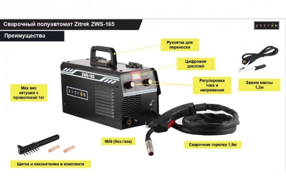 Сварочный полуавтомат Zitrek ZWS-165, MIG без газа, 165А Напряжение/Частота: 230В/50-60Гц Регулировка выходного напряжения: 16,5-21В Мощность: 3600Вт