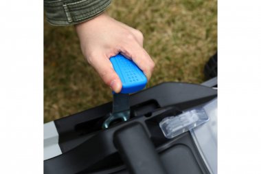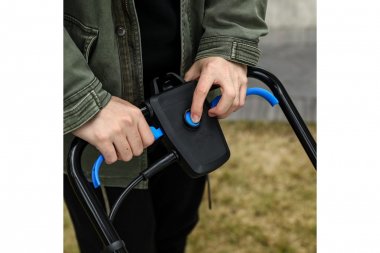 Большие задние колеса обеспечивают маневренность и хорошую проходимость по неровным поверхностям. Предусмотрена складная рукоятка для компактного хранения.