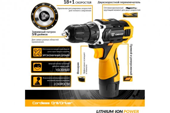 Аккумуляторная дрель Deko DKCD12FU-Li используется при строительных, слесарно-монтажных работах. Помогает быстро высверливать отверстия нужного диаметра как на деревянной, так и металлической поверхности, быстро вкручивать или извлекать крепеж. Две скорости дают возможность использования высокой или низкой скорости сверления. Идеальная регулировка для точного сверления благодаря 18-ти крутящих моментов. Зажимной патрон 3/8 дюймов для самых разных областей применения. Облегченная конструкция и прорезиненная ручка создают приятные ощущения, а дизайну эргономики. Фонарик эффективно освещает в темноте. Переключатель для прямого и реверсивного вращения.