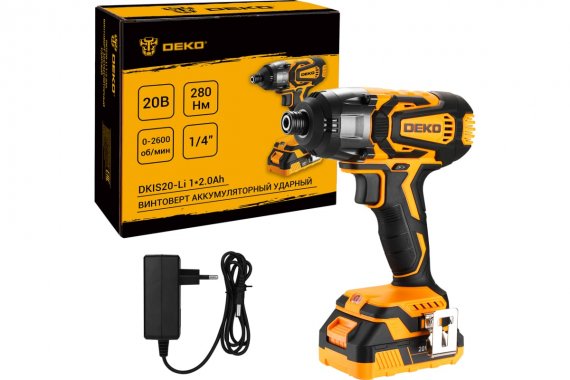 Винтоверт аккумуляторный ударный DEKO DKIS20-Li, 20В, 1*2.0Ач 280Нм 0-2600об/мин 0-3200уд/мин 235х85х215 мм