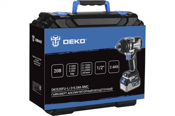 Deko 063-4433 Гайковерт аккумуляторный бесщеточный DKIS20FU-Li, 20В, 2*5.0Ач, 850 Нм, в кейсе