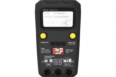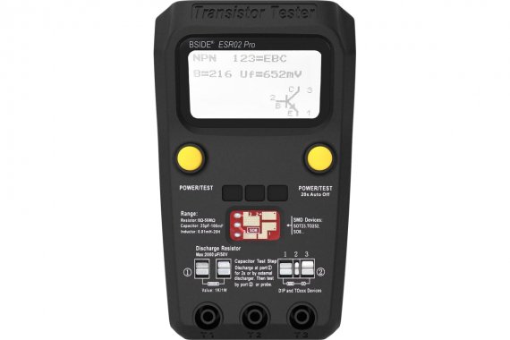 Тестер транзисторов BSIDE ESR02 pro предназначен для проведения измерений параметров и тестирования подключаемых SMD-компонентов, диодов, транзисторов (тип NPN, PNP, N-P channel MOSFET), тиристоры JFET. Прибор состоит из пластмассового корпуса с панелью управления, оснащенной кнопками для удобства работы.
