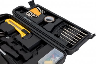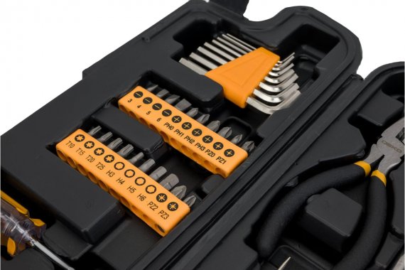 Набор инструментов для дома DEKO DKMT142 в чемодане 065-0308 включает в состав оборудование, выполненное из высокопрочной стали, которая прошла дополнительную закалку и специальную обработку. Это защищает инструмент от коррозии, а также делает его более устойчив к любым физическим деформациям.