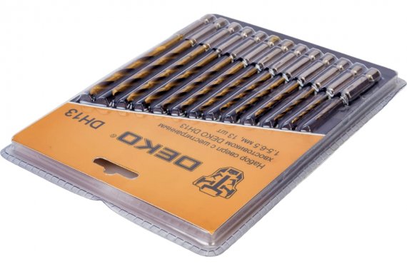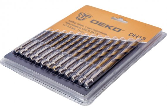 Набор сверл с шестигранным хвостовиком DEKO DH13, 1.5-6.5 мм, 13 шт металл Тип хвостовика шестигранный (1/4HEX - E) Материал сверла HSS-TIN