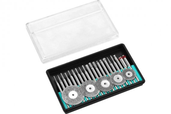 В набор входят 18 шарошек, предоставляющих возможность обработки поверхностей различного профиля, а также круги отрезные диаметром. Оснастка изготовлена из инструментальной стали. Режущая кромка выполнена из технических алмазов.