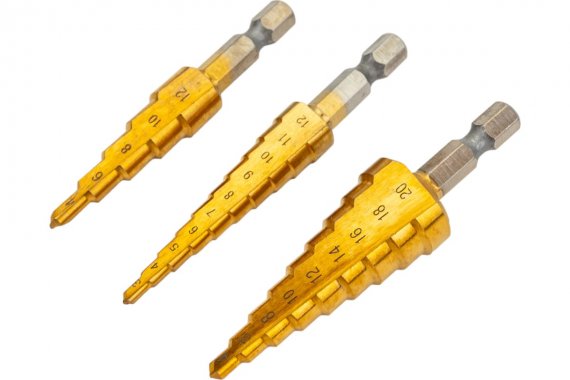 Набор сверл ступенчатых DEKO DH20 3-12, 4-12, 4-20 мм, 3 шт металл Тип хвостовика шестигранный HSS-TIN пакет