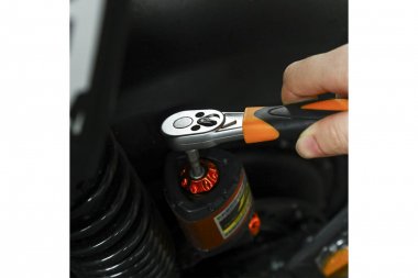 Эргономичная двухкомпонентная рукоять ключа-трещотки комфортна при работе. Набор поставляется в удобном пластиковом кейсе для рационального хранения и транспортировки.