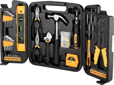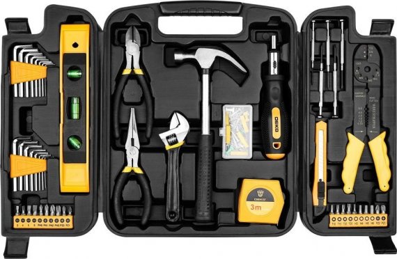 Набор инструмента для дома в чемодане DEKO DKMT130 065-0741 включает в состав оборудование, выполненное из высокопрочной стали, которая прошла дополнительную закалку и специальную обработку. Это защищает инструмент от коррозии, а также делает его более устойчив к любым физическим деформациям.