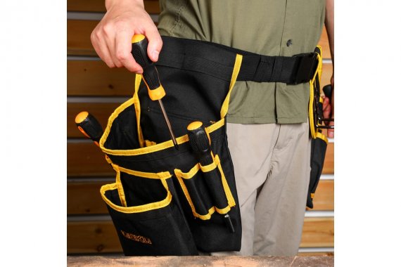 Сумка для инструментов DEKO M 065-0801 идеально подходит для хранения и переноски инструментов. Сумка-пояс пригодится строителям и монтажникам, а также будет полезна в быту. На пояс надеты 2 сумки, между которыми имеется держатель для молотка, поэтому инструменты можно распределить равномерно. Сумка изготовлена из прочного материала и прослужит долго. Карманы разных размеров позволяют вместить все необходимые инструменты и расходники. Сумка оснащена пластиковой застежкой-фастекс, благодаря которой сумка надежно держится на поясе.