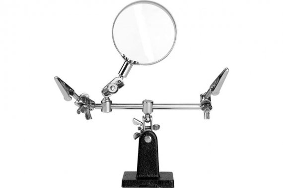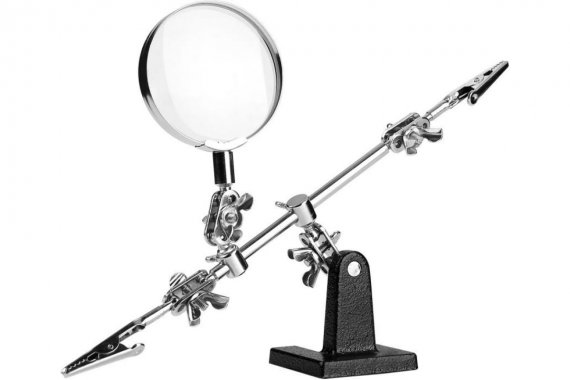Оснащен двумя зажимами с зубьями "крокодил", позволяющими закреплять нужные детали, а также лупой, за счет которой можно выполнять 3-кратное увеличение. Есть возможность регулировки положения и поворота линзы, ее можно настроить, выбрав удобное положение.