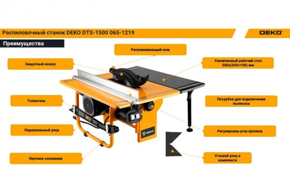 Распиловочный станок DEKO DTS-1500 230В 50Гц 1500Вт Количество зубьев: 24 шт. 2950об/мин Диаметр 200мм Посадочный диаметр 16мм 515X245X14 мм