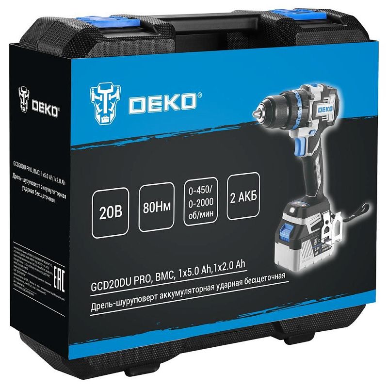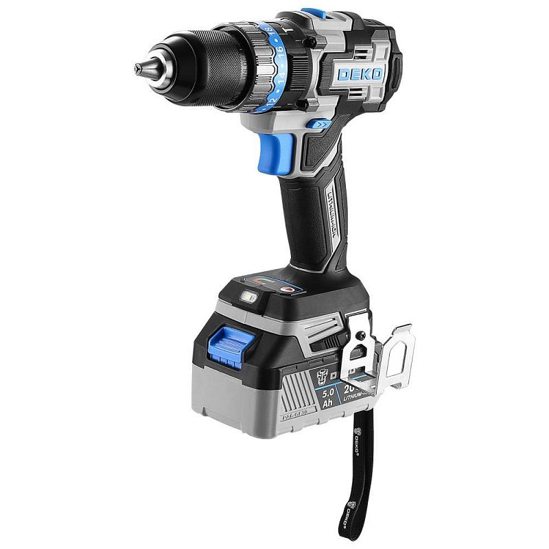 Дрель-шуруповерт аккумуляторная ударная бесщеточная DEKO GCD20DU PRO в кейсе, 20В, 1х5.0 Аh,1х2.0 Аh