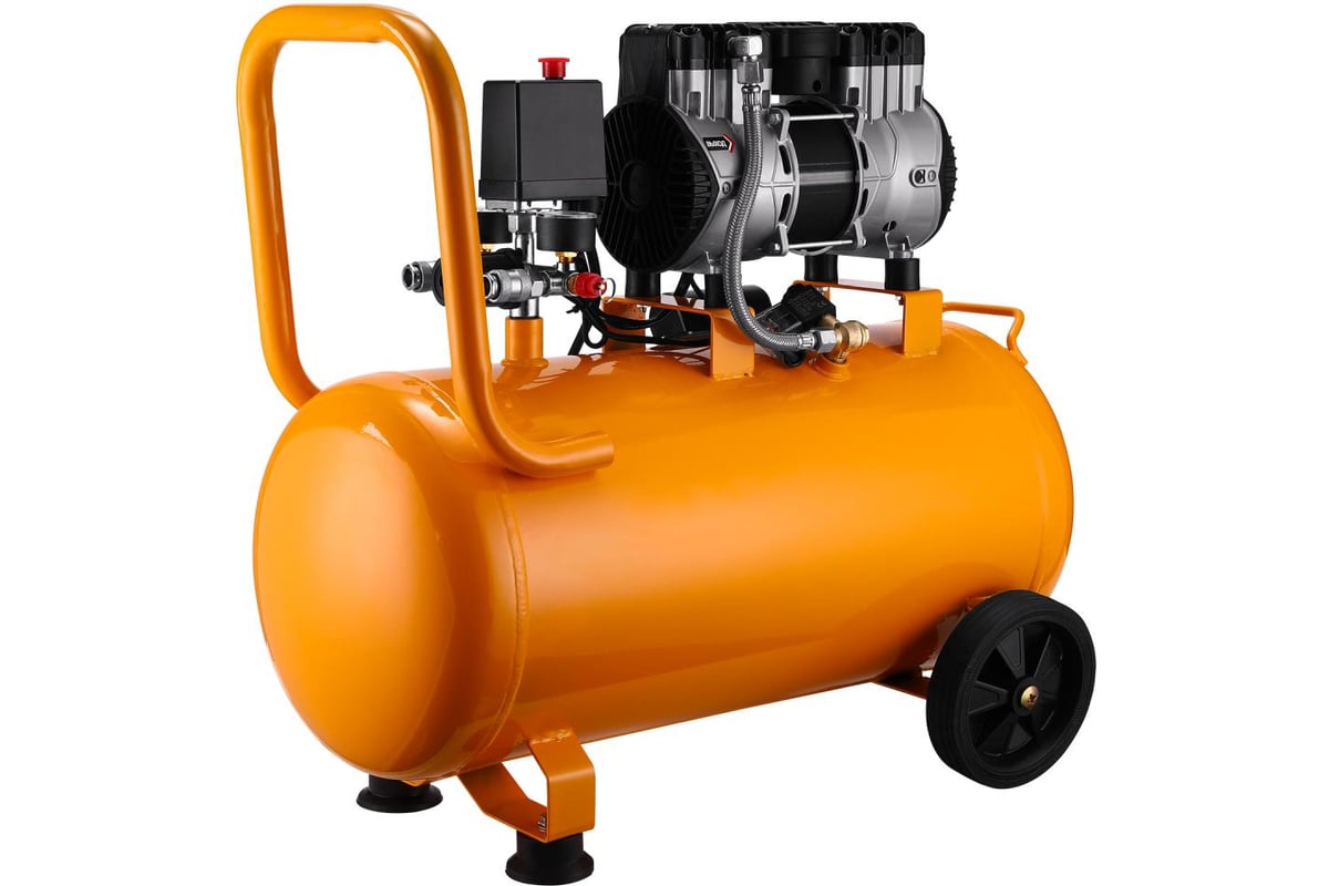 Максимальное давление, создаваемое компрессором, достигает 8 Бар. Устройство не требует заправки маслом, что упрощает обслуживание и делает его удобным для пользователей, которые ценят простоту и надежность. Малошумная работа — дополнительное преимущество, особенно при использовании в закрытых помещениях.