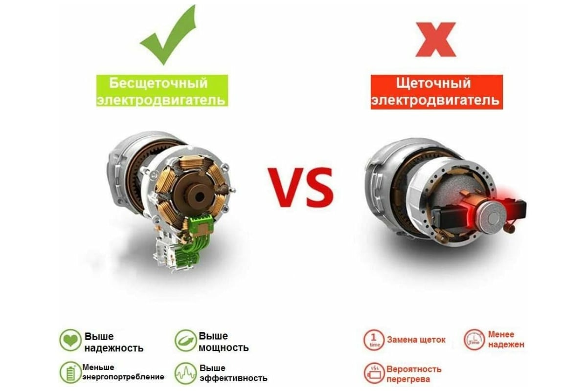 Бесщеточный двигатель выше мощность, дольше время работы, компактнее размеры