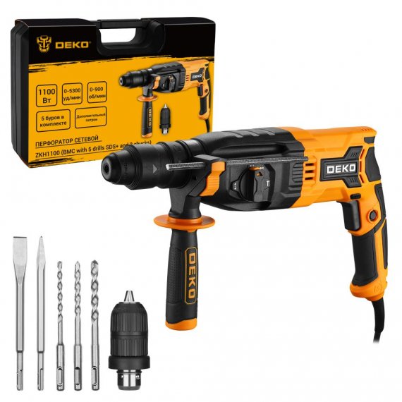 Перфоратор сетевой DEKO ZKH1100 в кейсе с набором из 5 буров SDS+ и дополнительным патроном