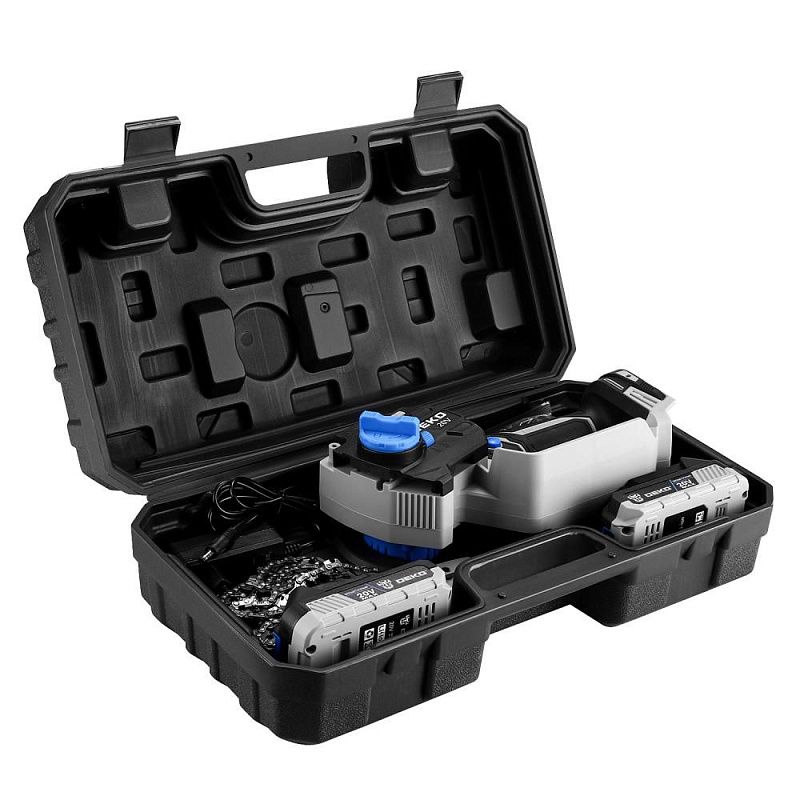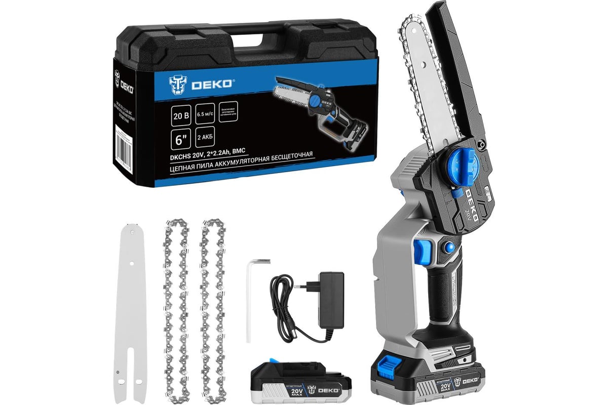 Пила цепная аккумуляторная бесщеточная DEKO DKCHS 20V, 6", 20В, 2x2.2Ач, 2 шины и 3 цепи в кейсе