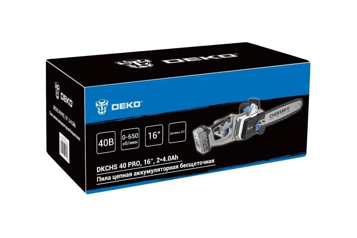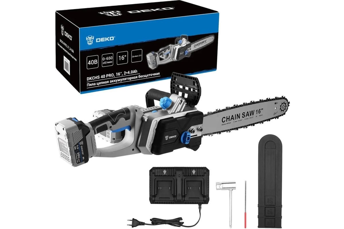 Пила цепная аккумуляторная бесщеточная DEKO DKCHS 40 PRO, 16", 2х20В, 2x4.0Ач, двойное з/у