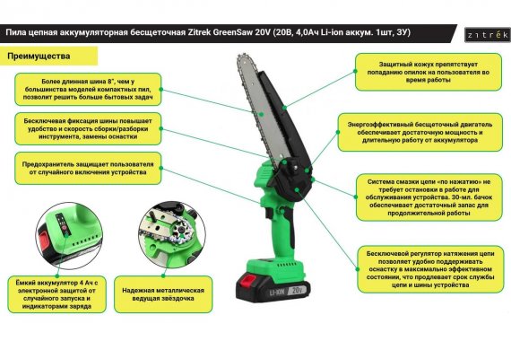 Пила цепная аккумуляторная бесщеточная Zitrek GreenSaw 20V (20В, 4,0Ач Li-ion аккум. 1шт, ЗУ)