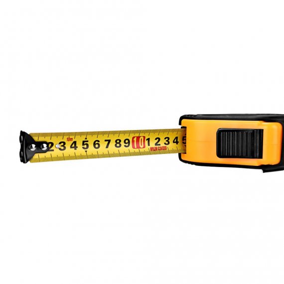 Корпус рулетки изготовлен из ударопрочного пластика с прорезиненными вставками, что обеспечивает долговечность и устойчивость к механическим воздействиям. Яркая разметка на полотне позволяет легко считывать показания даже при слабом освещении, а лента устойчива к истиранию и изгибам.