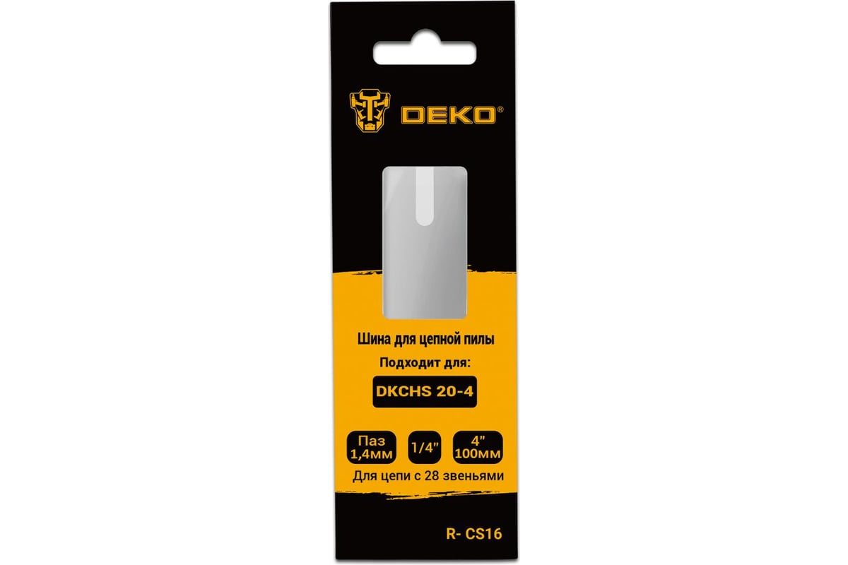 Шина для цепной пилы DEKO R-CS16, 4", 1.4 мм, 28 звеньев подходит для модели DKCHS 20-4. Поставляется в картонной коробке.