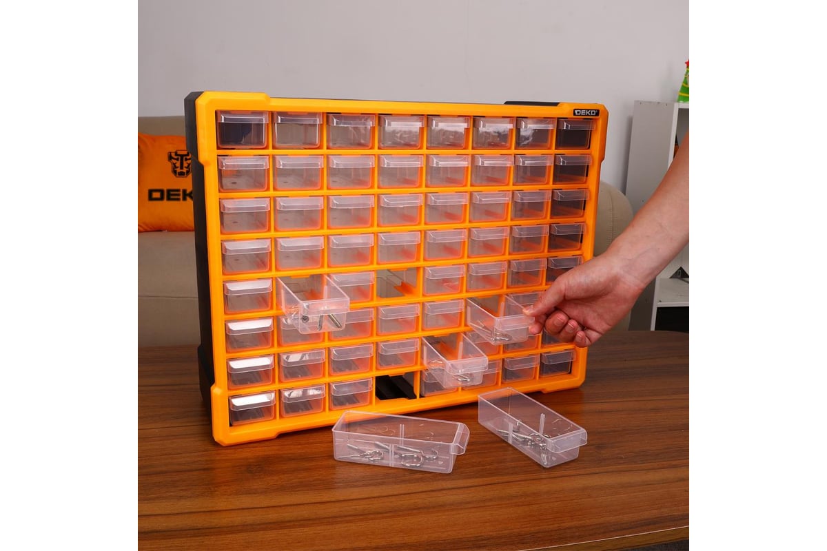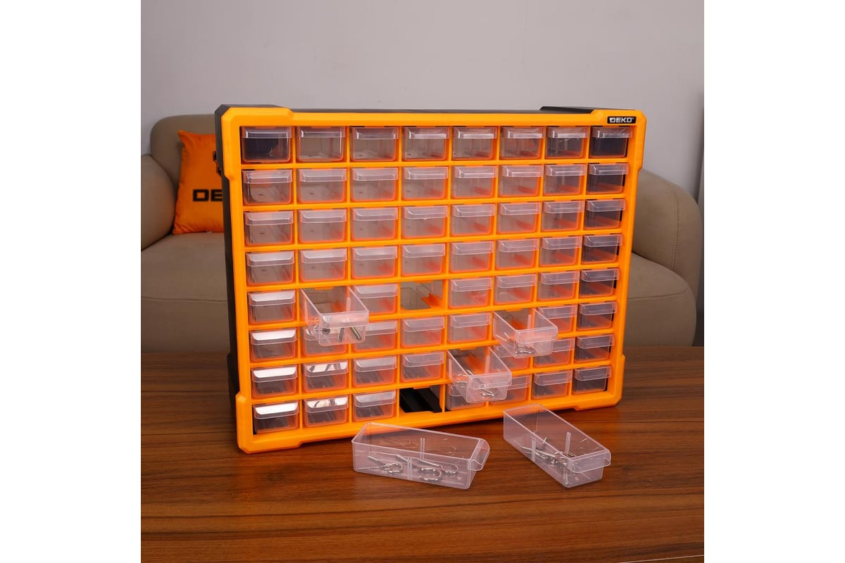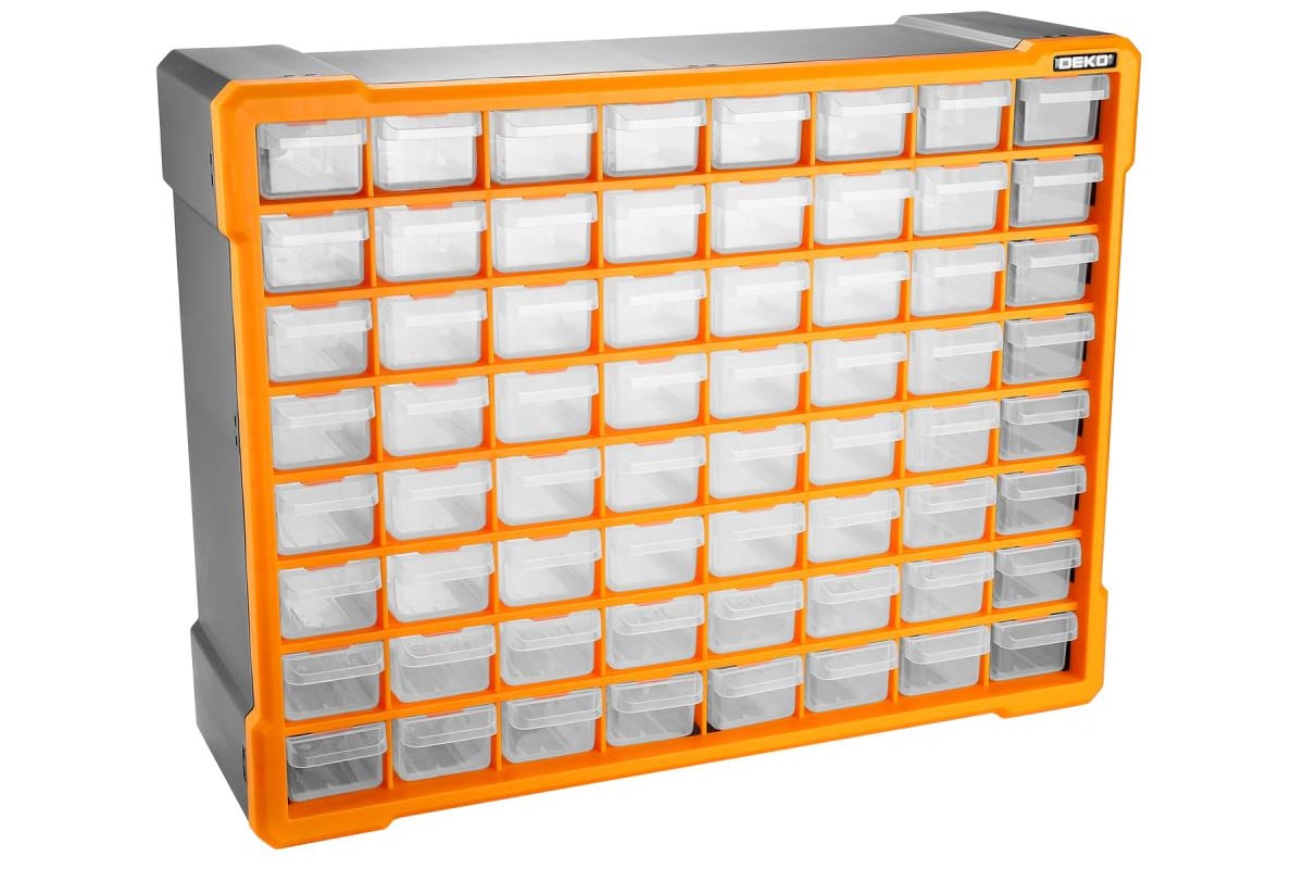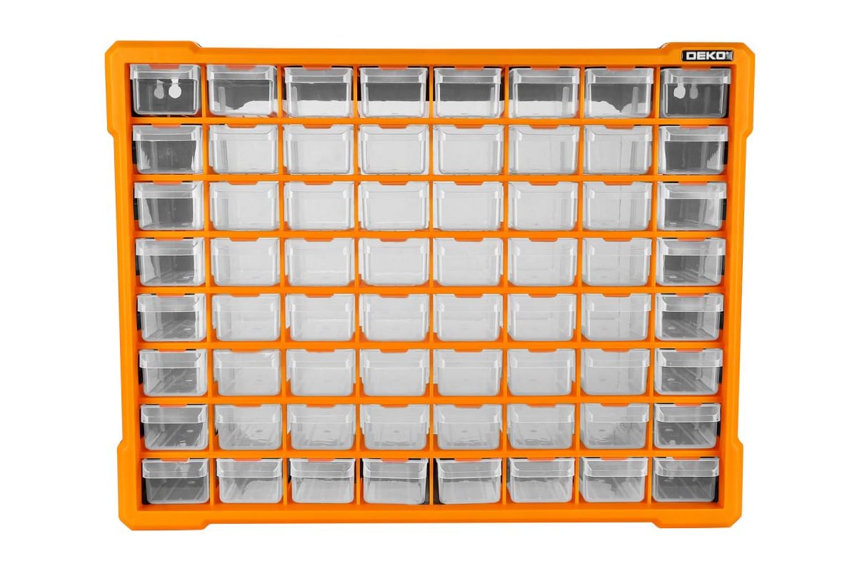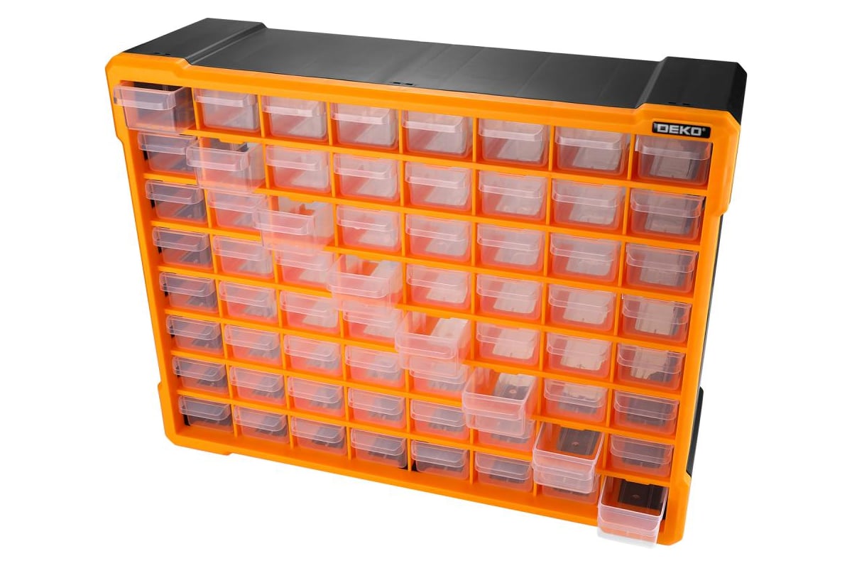 Система хранения DEKO RDKPS64 представляет собой удобный контейнер с 64 ячейками для хранения инструментов и аксессуаров.