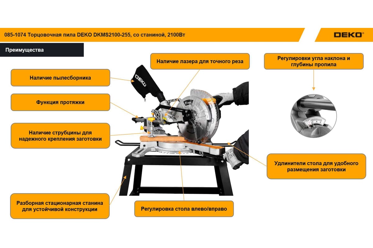 Торцовочная пила DEKO DKMS2100-255, со станиной, 2100Вт