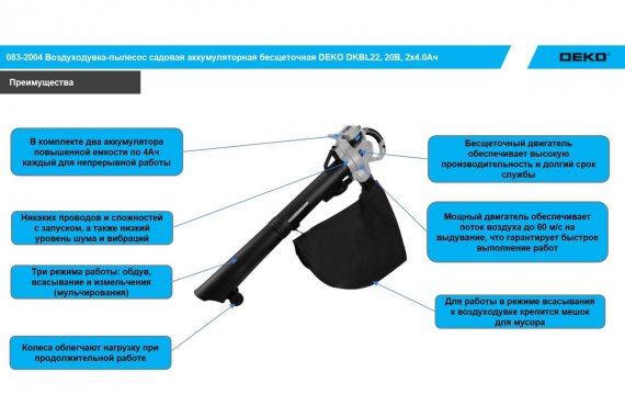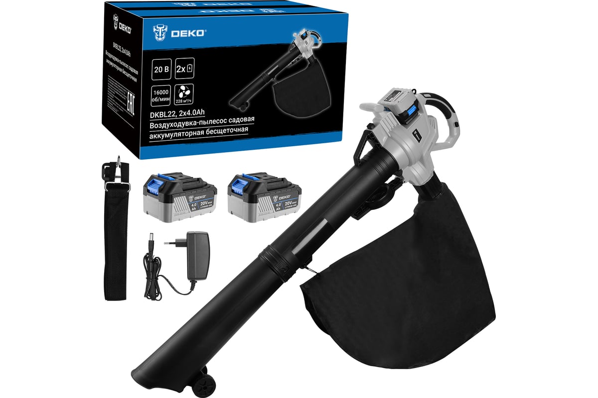 Воздуходувка-пылесос садовая аккумуляторная бесщеточная DEKO DKBL22, 20В, 2x4.0Ач